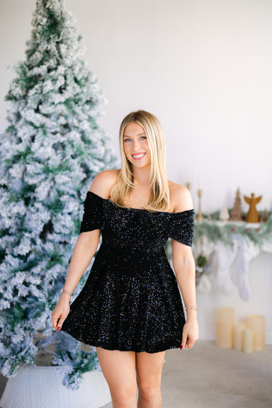 This off the shoulder velvet sequin mini dress is the perfect holiday staple! It features a front bow detail and back zipper closure! 50% pet, 45...