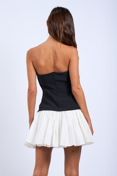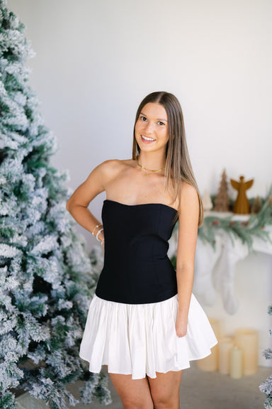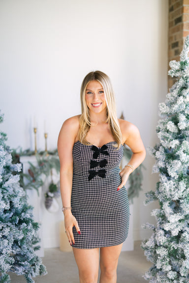 Adorable black & white tweed strapless mini dress with front velvet bow detailing and back zipper closure! 80% polyester, 20% acrylic - doubl...