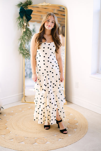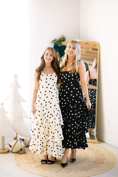 Adorable polka dot layered maxi dress w/ adjustable straps, back tie & zipper closure! 100% polyester Runs true to size
