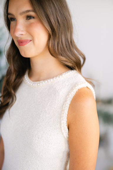Adorable knit sleeveless mini dress w/ pearl detailing around the neckline! 95% polyester, 5% spandex - double lined Runs true to size Model is ...