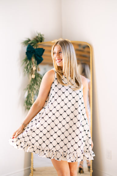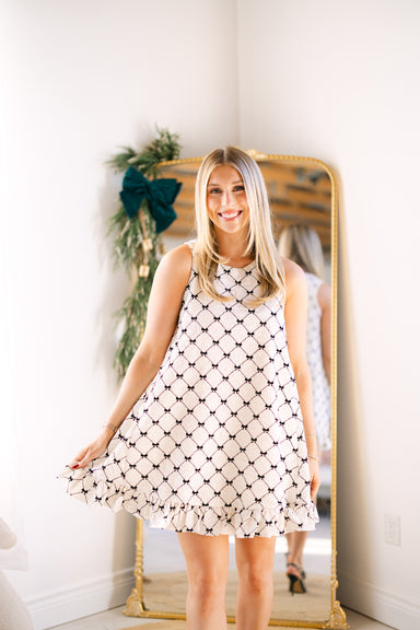 Sleeveless bow print pearl button back detail mini dress with mini ruffle hem! 100% polyester Runs true to size Model is 5'6 and is wearing a small