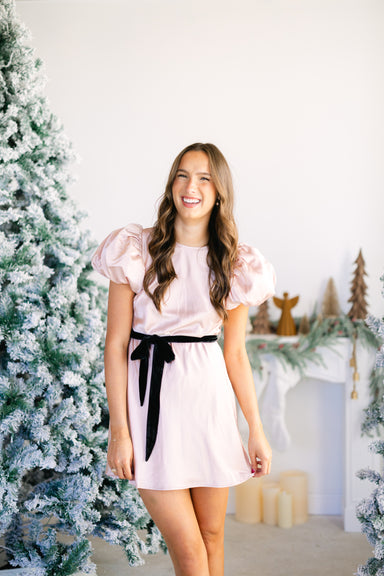 Adorable satin puff sleeve mini dress w/ velvet bow waist tie and back button closure! 95% polyester, 5% spandex - double lined Runs true to size...