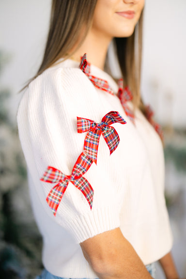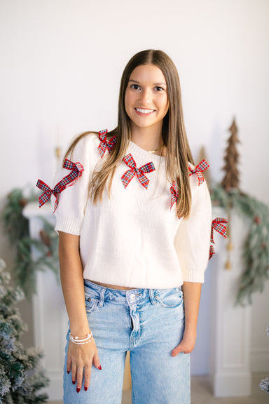 Adorable short sleeve sweater w/ plaid bow detailing! 45% acrylic, 26% nylon, 29% polyester Runs true to size Model is 5'2 and is wearing a small