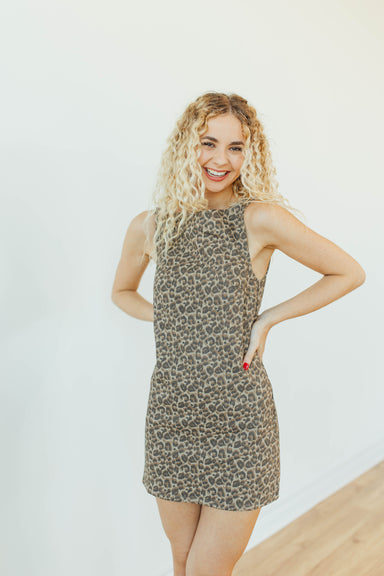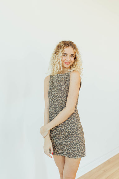 leopard print boat neck sleeveless mini dress with back zipper closure ! 100% cotton Runs true to size Model is 5'9 and is wearing an x-small