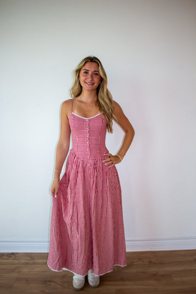 Gingham Midi with Lace Trim and side zipper closure with adjustable straps! 90% Cotton, 10% Polyester Runs true to size Model is 5'7 wearing a small
