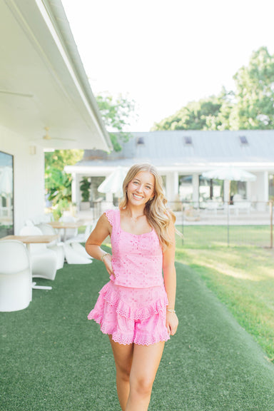 Adorable pink smocked back eyelet ruffle shorts!  100% cotton, double lined  Runs true to size  Model is 5'3 and is wearing a small