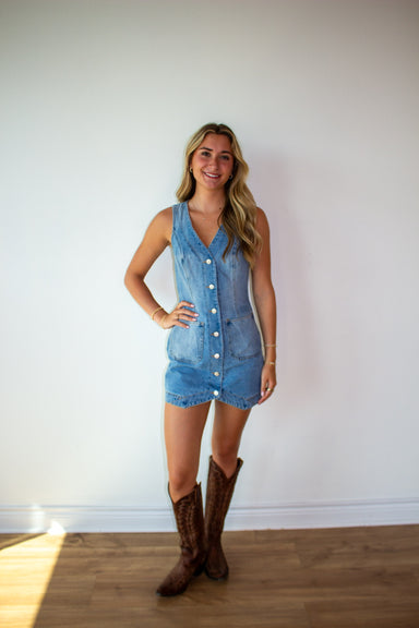 Denim Button Down V Neck Mini Dress! 98% Cotton, 2% Spandex Runs true to size Model is 5'4 wearing a small